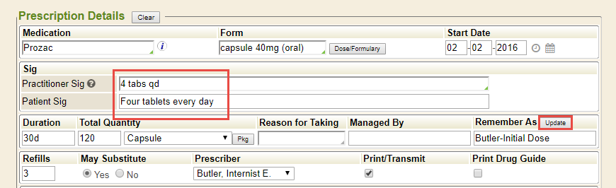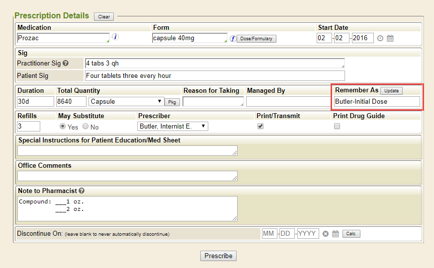 Updating or changing a remembered prescription is just as easy, if not easier. To begin, load the remembered prescription, as shown above. Once all of the fields populate as expected, make any and all changes necessary. With the changes made, ensure the Remember As keyword is set accordingly, and click the Update button. This is used to change previously saved scripts anytime after the initial save.