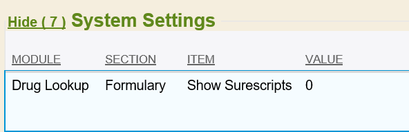• System Setting E-Chart | Meds | SureScripts Staging must be disabled (value 0) when e-prescribing is live on the production database.