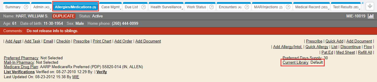 When creating or accessing remembered prescriptions, the correct medication library needs to be set as the Current Library in the chart’s Allergies/Medications chart tab.