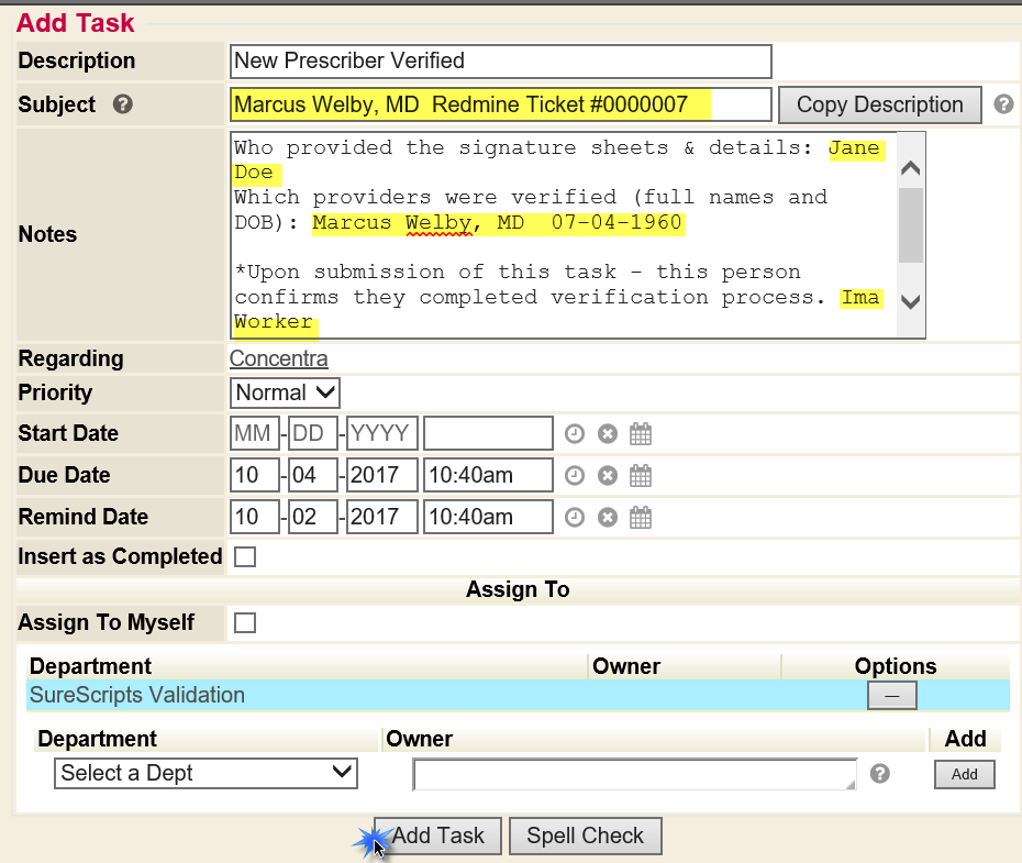 1. Once the request is processed, a reply to the task will be provided, and a SureScripts Prescriber ID (SPI) will be assigned to the provider. Always check the provider prior to notifying the client.