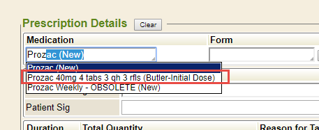 3. In the Medication autocomplete field, begin typing and select the medication name. It is important not to overwrite a saved or remembered prescription. To avoid overwriting a saved prescription, use medications notated with (New). Selecting a (New) choice will prompt users to fill out each field.