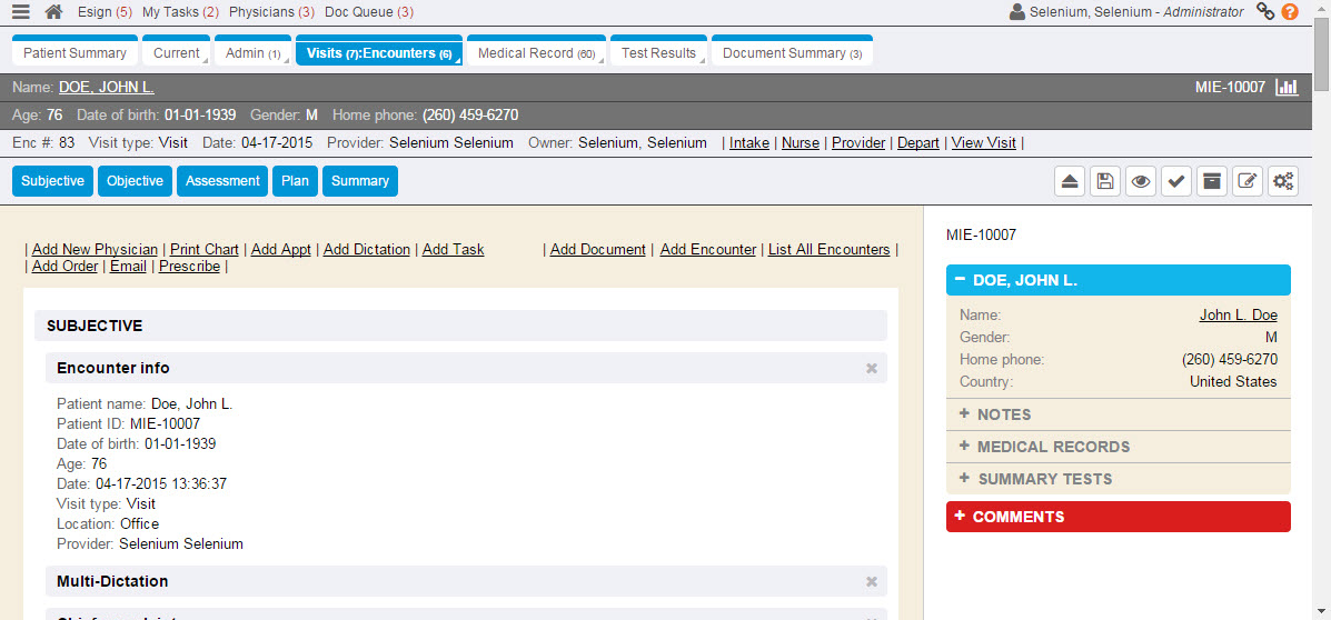 • Also available in the Patient Info toolbar is the side chart icon, which displays patient historical information such as medical records, past encounters, notes and comments.