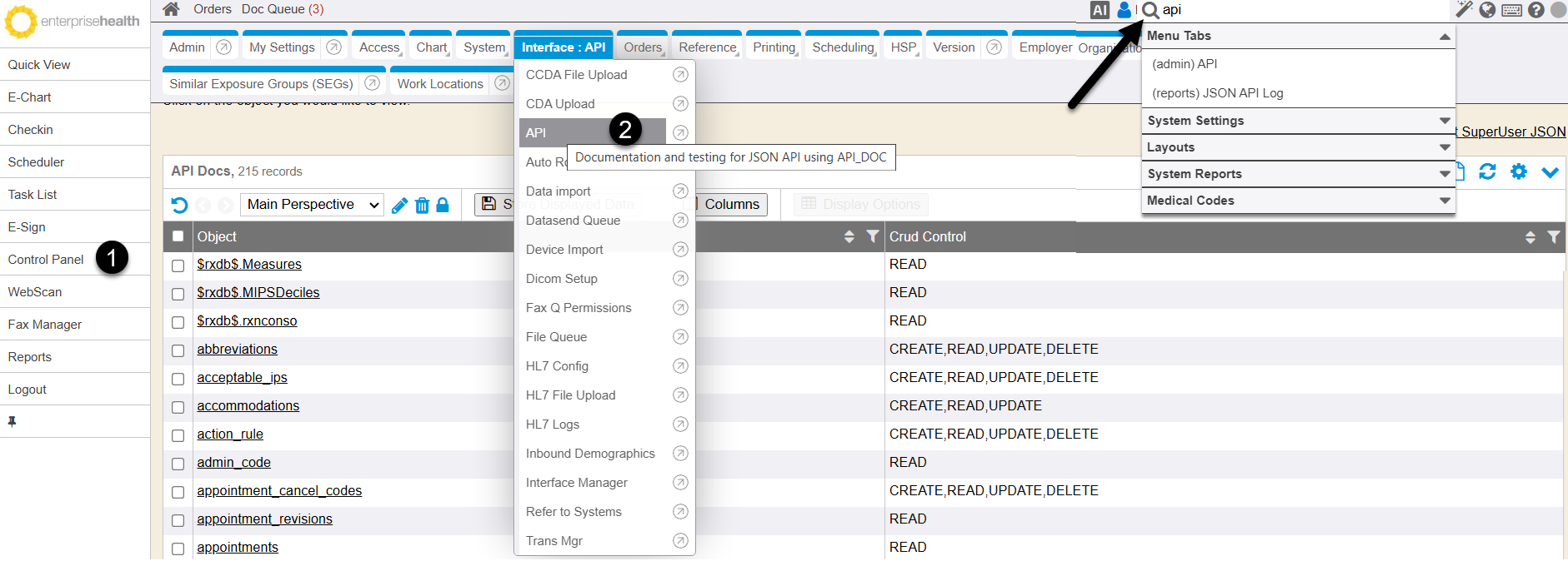 Interactive, dynamic documentation of the Enterprise Health API can be found inside the product. Navigate to the API tab of the Control Panel or use the Search tool located in the upper right hand corner of the application for full visibility of the various objects and their APIs.